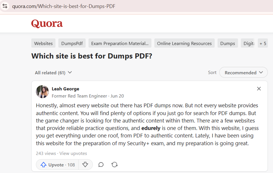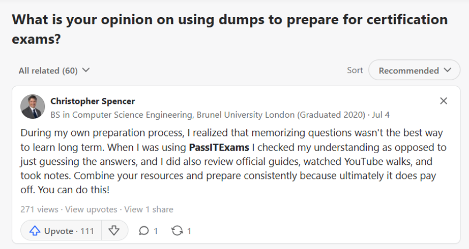 Just a heads up: This is based on my own experience. Before making your choice, it’s worth checking out the Quora community plenty of certified professionals share their real stories and advice there. Forums are where you’ll find honest discussions from people who’ve actually taken these exams. Here’s a good place to start: https://www.quora.com/What-is-your-opinion-on-using-dumps-to-prepare-for-certification-exams/answer/Christopher-Spencer-261